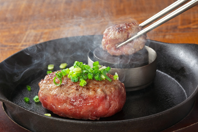 「極味や」は現在日本国内に16店舗、2025年には海外にも進出。看板商品の極味やハンバーグは、焼き石と鉄板の2スタイルで展開。店舗ごとに異なるスタイルで、国産牛と黒毛和牛をブレンドした“自分で焼く”ハンバーグを楽しめます。