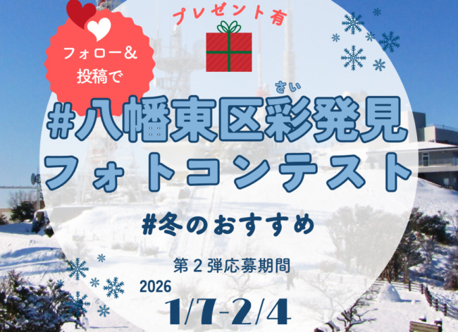 八幡東区への誘客促進を図るため、「#八幡東区彩さい発見フォトコンテスト」 第2弾を開催します。第2弾のテーマは「八幡東区の冬のおすすめ」 です。八幡東区の冬におすすめのスポットやお気に入りの過ごし方をInstagramで募集します。