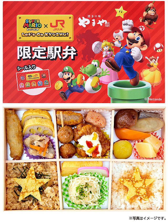 「スーパーマリオ×JR九州 ~Let’s GO KYUSHU!~」をテーマに、やまやのピリッとおいしい辛子明太子をはじめ、佐賀県名物のいかしゅうまいや、宮崎県名物のチキン南蛮、熊本県名物のからしレンコンなど、九州各地の名物を取り入れたおかずが一つに詰まったお弁当です。