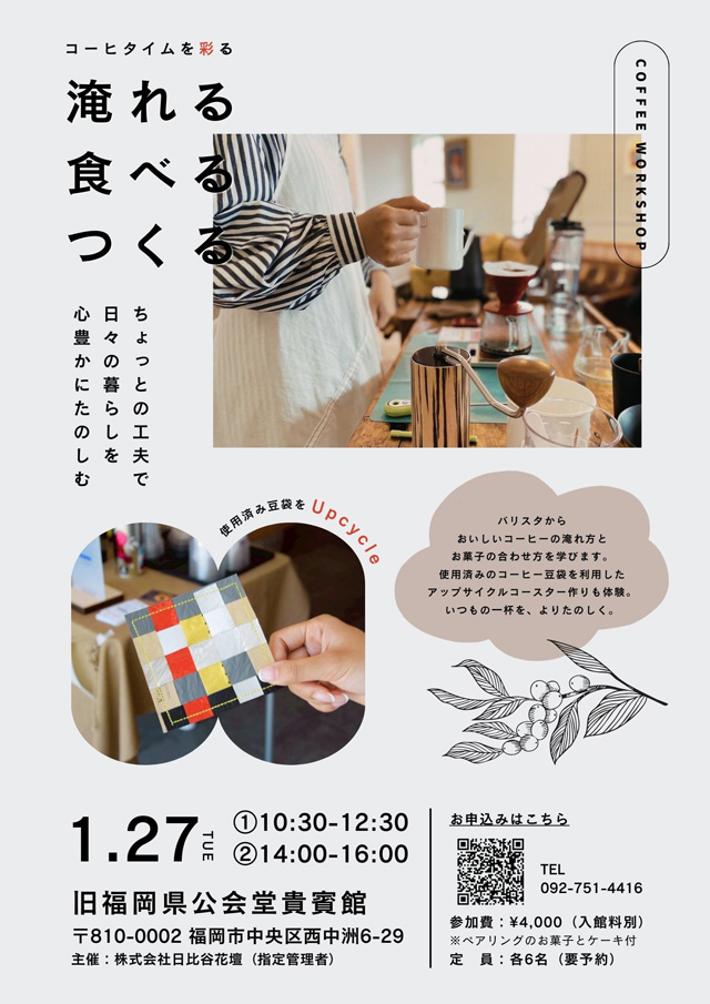 2026年1月27日(火)福岡市中央区西中洲にある重要文化財、旧福岡県公会堂貴賓館(福岡市中央区西中洲6番29号)にてコーヒーワークショップ「コーヒータイムを彩る 淹れる・食べる・つくる」(予約制)を開催します。