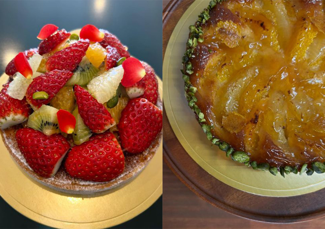福岡平飼いたまご「あかね農場」のブランド卵「あかねの虜」と、九州産の牛乳で作る自家製カスタードを使ったフランジパーヌ。うきは産のパール柑とスイートスプリングの上には、アプリコットジャムを塗って、スイートスプリングの皮のシロップ漬けとピスタチオで飾り付けました。
