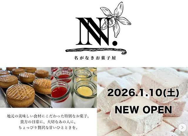 2026年1月10日(土)「名がなきお菓子屋」(うきは市吉井町657-4)がオープンしました。営業時間は11:00~16:00(月曜日は定休日)。