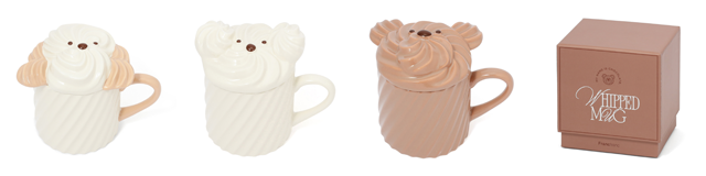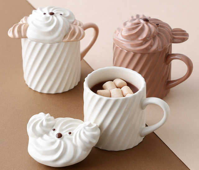 ホイップクリームで作ったような動物の顔をした、蓋付きのマグです。たれ耳の犬はキャラメル味、白い犬はミルク味、くまはチョコレート味をイメージ。ちょっと一息つきたいティータイムに、ホイップのようなやすらぎの時間をお楽しみください。パッケージはギフトにもふさわしいデザインに仕上げているので、贈り物にも最適です。