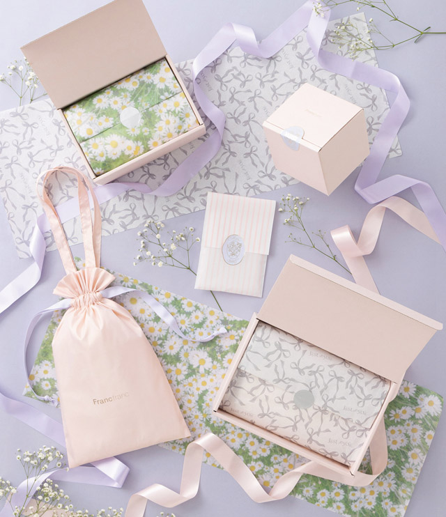 今回の新デザインでは、ギフトのサイズに合わせた豊富なラインナップ。さらに、もらった後もリユースできる巾着ギフトバッグや、開けた瞬間に心高鳴るデザインが施されているギフトボックスなど、受け取った人が思わず笑顔がこぼれるような、感動の仕掛けを随所に散りばめています。大切な人への想いを託すギフト。その時間がより心に残るものとなるよう、Francfrancは、贈る人にも受け取る人にも、心高鳴る体験をお届けします。