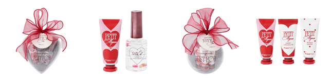 オーナメントのようなハート型クリア容器に入った、ネイルオイルとハンドクリームのハンドケアセットです。ネイルオイルはお花入りで、見た目も華やか。ハンドクリームはラズベリーの香りで、ネイルオイルはバレンタインらしいスウィートチョコレートの香りを楽しめます。
