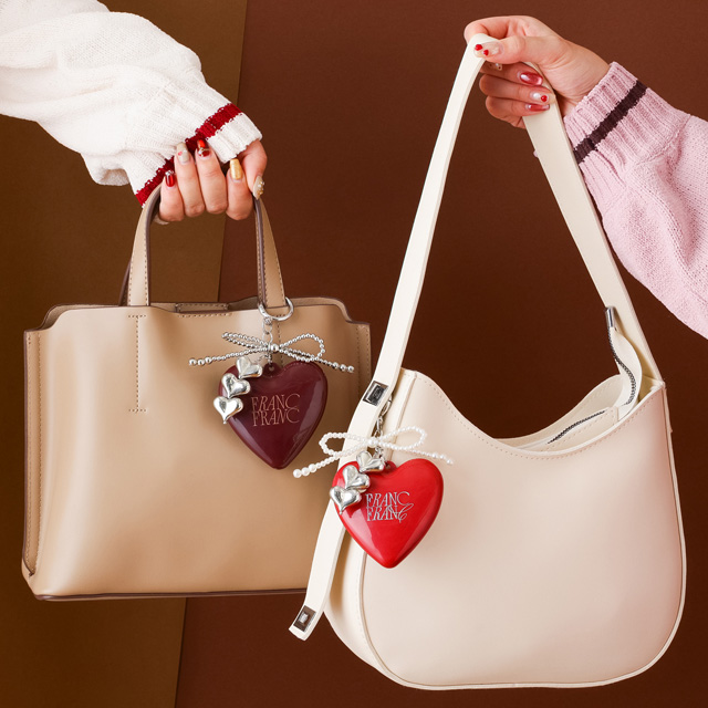 ハート型のミニポーチです。リップや目薬などの小物を収納するのにぴったりなサイズ感。パイピングデザインを取り入れたバイカラーの配色が、こだわりのポイントです。付属のストラップを付ければバッグチャームとして使用でき、小さなバッグの日にも活躍します。