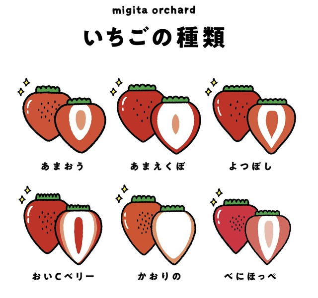 いちご狩り食べ放題が出来る品種は6種類。「あまおう、あまえくぼ、よつぼし、おいCベリー、かおりの、紅ほっぺ」※生育状況により品種が限られる場合があります。