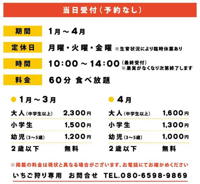 2026年1月10日(土)~4月下旬(水・木・土・日)10:00~14:00(無くなり次第終了)、右田果樹園(久留米市田主丸町地徳3024)にて「いちご狩り」がスタート。