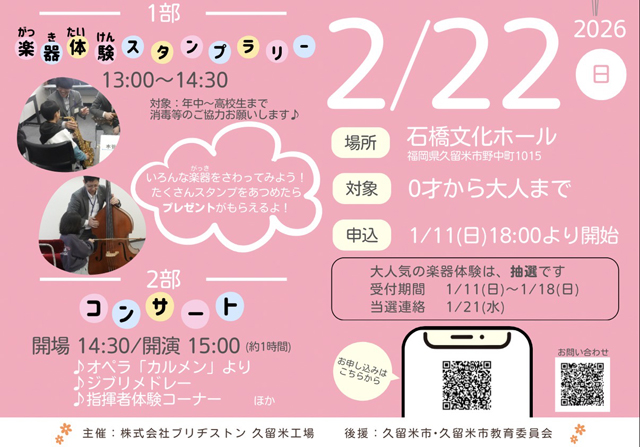 2026年2月22日(日・祝)石橋文化ホール(久留米市野中町1015)にて「ブリヂストン吹奏楽団久留米 こどものためのコンサート」が開催されます。