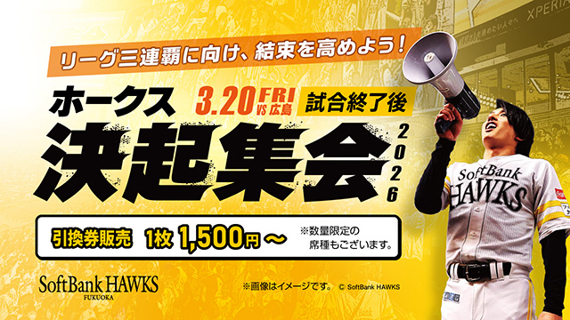 決起集会でホークス選手が登場する「ホークス応援指定席(1塁側外野エリア)」および、その中でもより選手を近くで見ることができる「選手『最』間近席」「選手間近席」のチケットを1月18日(日)10:00より販売!