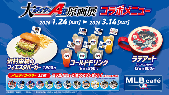BOSS E・ZO FUKUOKA 3F「MLB café FUKUOKA」では、「大『ダイヤのA actⅡ』原画展」とコラボグルメを販売します。オリジナルのバーガーやドリンク、ラテアートなどを楽しめます。さらに、コラボメニュー注文でノベルティをプレゼント!