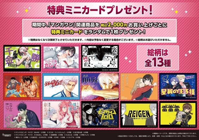 期間中、「マンガワン」関連商品を2,000円(税込)購入ごとに特典カード(全13種)をランダムで1枚プレゼント(※絵柄は選べません)。