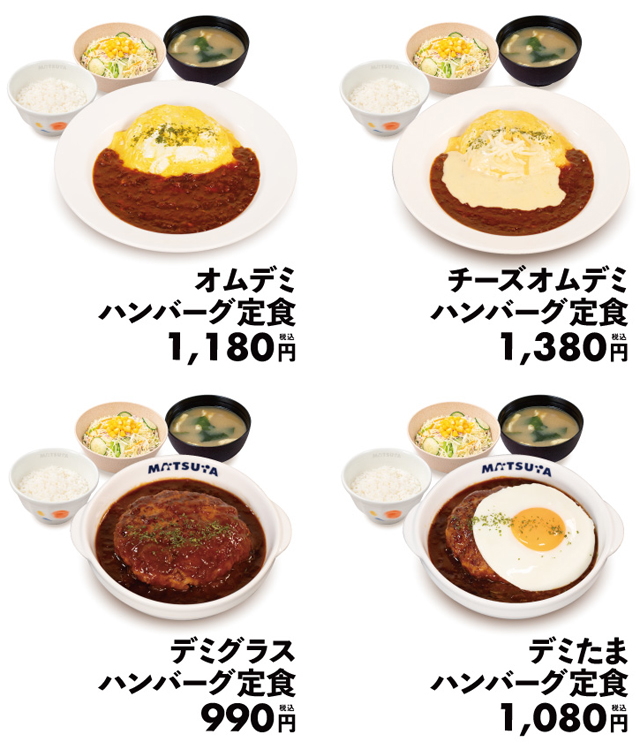 また、オムデミハンバーグ定食のほかにも、多彩なラインナップを販売。シンプルに味わう「デミグラスハンバーグ定食」、玉子のまろやかさをプラスして味変を楽しむ「デミたまハンバーグ定食」、とろ~りチーズとオムレツのコラボ「チーズオムデミハンバーグ定食」も販売。