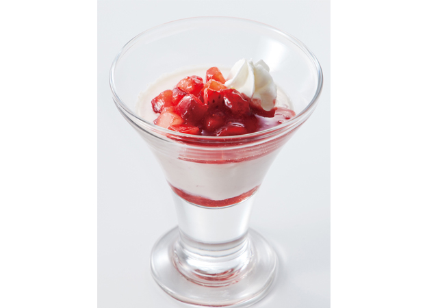 デザートも紅と白のコントラストで。なめらかな口どけのパンナコッタに甘酸っぱい苺ソースを合わせた、季節のデザートならではの華やかな味わいが楽しめる一品です。