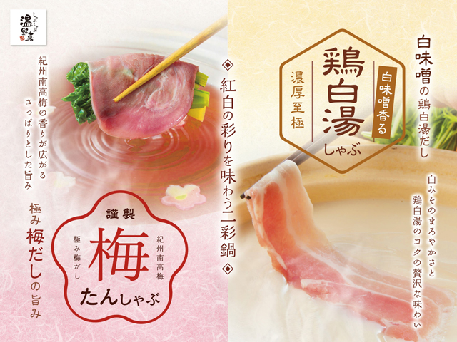 本フェアでは、毎年好評の「梅たんしゃぶ」と、今年初登場となる“まろやかなコクと旨み”が特長の「鶏白湯しゃぶ」をラインアップ。“紅”の梅たんしゃぶと“白”の鶏白湯しゃぶを組み合わせた紅白二彩の構成は、しゃぶしゃぶ温野菜として今年初の試みとなります。