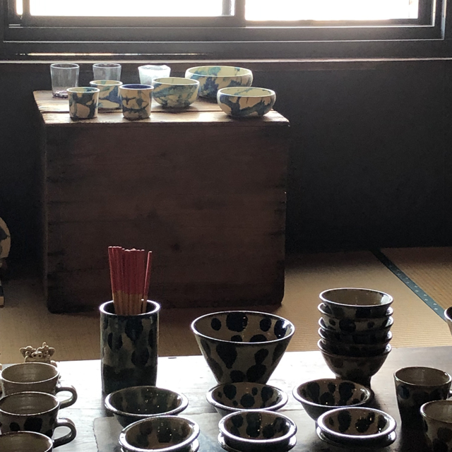 JR福間駅からほど近い場所にあるナンカの広々とした畳の間に所狭しと沖縄のうつわが並びます。