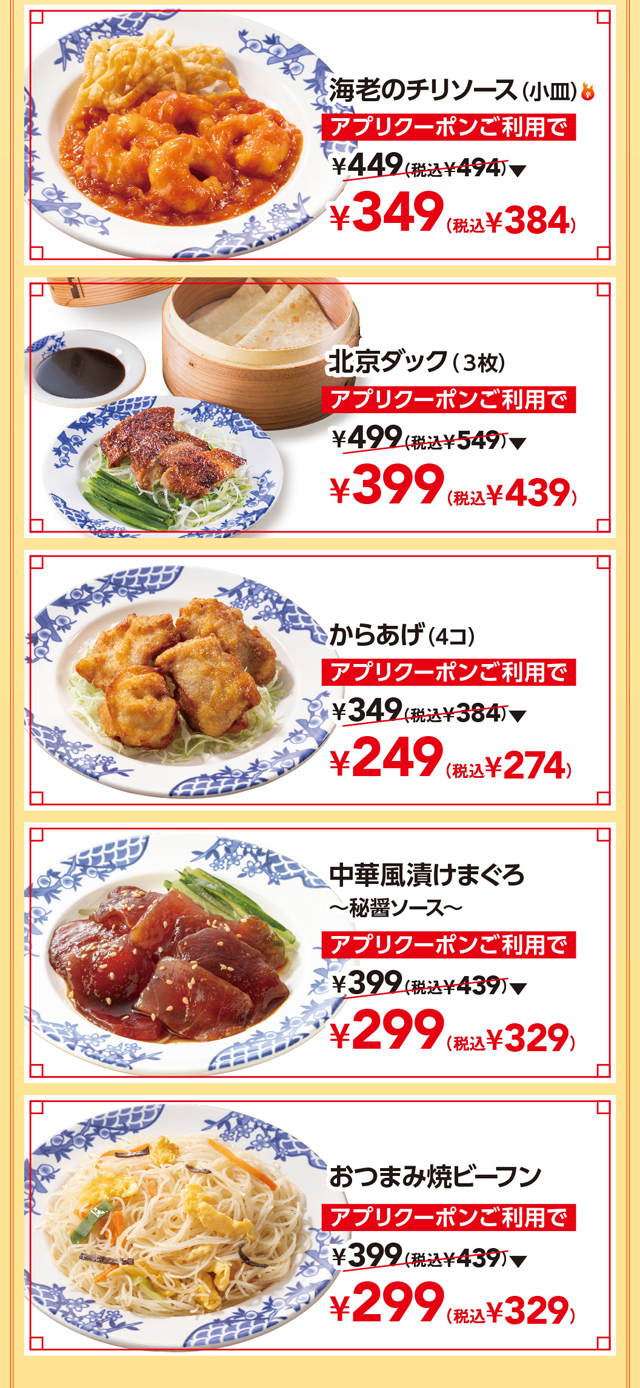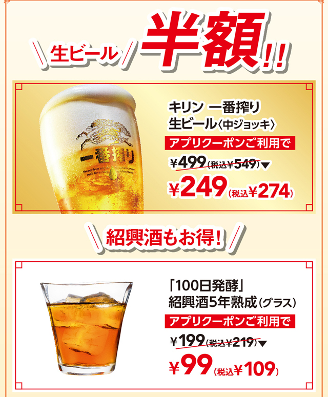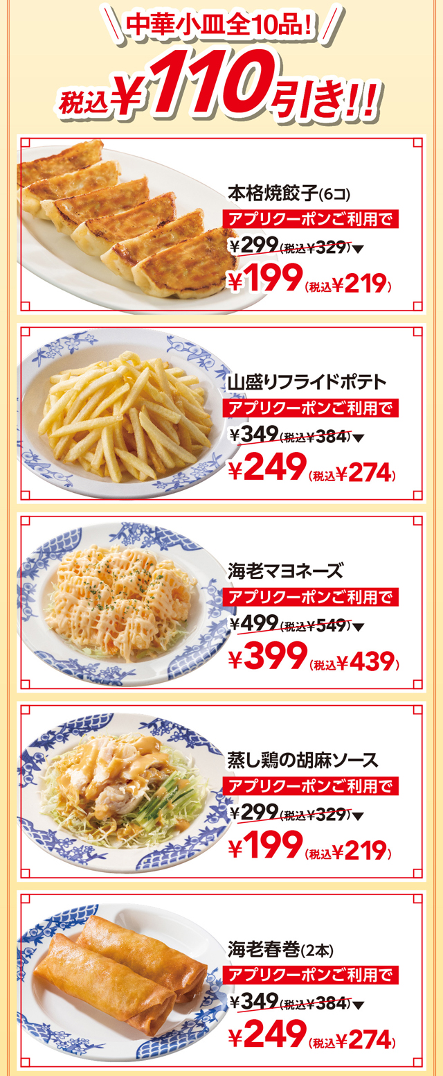 餃子をはじめ人気の、中華小皿10種が税込110円引き、更にビール・紹興酒が半額。