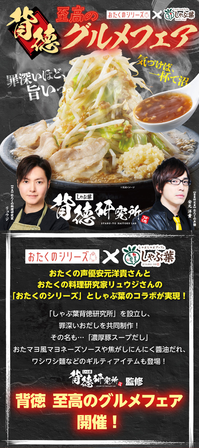 株式会社すかいらーくレストランツが運営する「しゃぶ葉」では、2026年1月22日(木)より、声優安元洋貴さんが統括プロデューサーを務め、料理研究家リュウジさんがマヨアドバイザーである「おたくのシリーズ」とのコラボにて「しゃぶ葉背徳研究所」を設立。共同開発のおだしが登場する「背徳 至高のグルメフェア」を開始。
