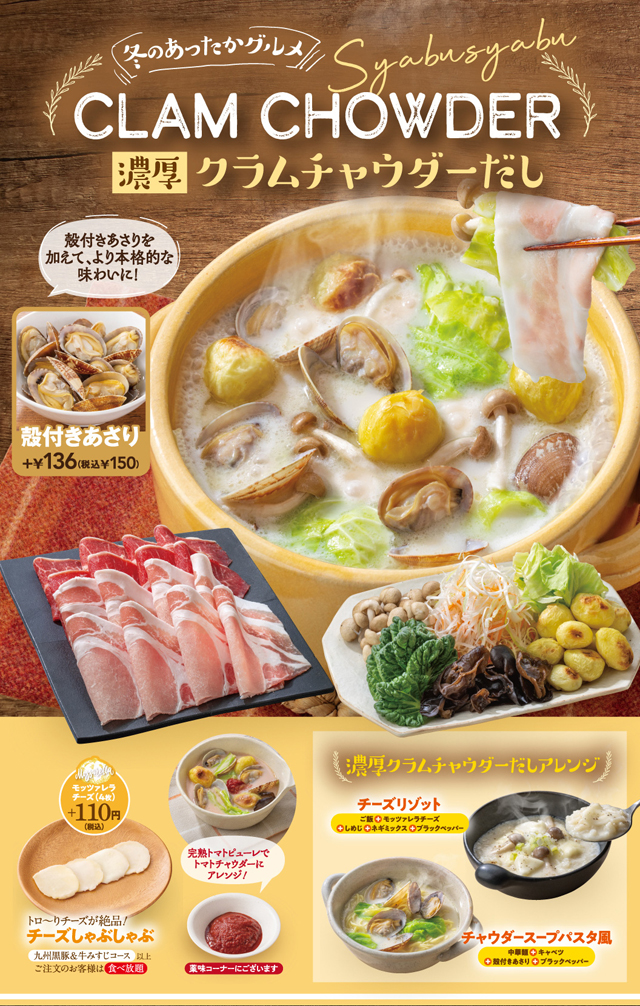 ③昨年大好評!冬にぴったりの濃厚クラムチャウダーだし、通称“クラチゃぶ”が復活!濃厚な旨みとクリーミーな味わいが特徴の、あさり香るおだし。厳選豚は甘みのある九州黒豚を提供!