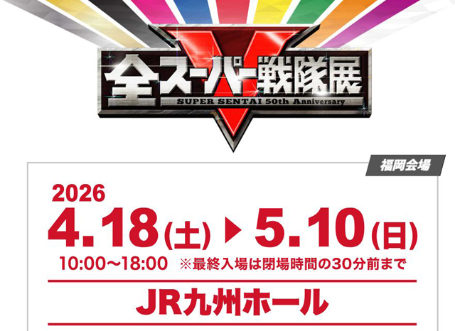 2026年4月18日(土)~5月10日(日)10:00~18:00(最終入場は17:30まで)、JR博多シティ9FのJR九州ホール(福岡市博多区博多駅中央街1-1)にて、「全スーパー戦隊展」が開催決定!