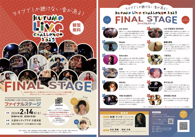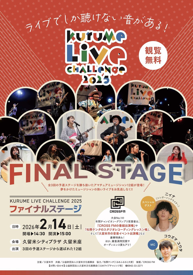 「くるめライブチャレンジ2025・ファイナルステージ」では、全3回の予選ステージを勝ち抜いたアマチュアミュージシャンが、年間チャンピオンを目指して,熱いステージを繰り広げます!