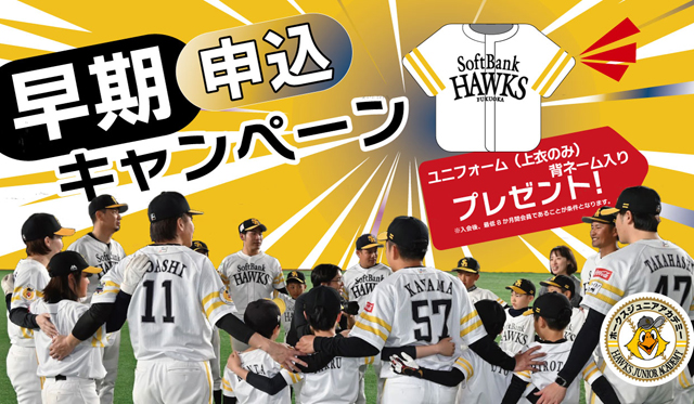 ホークスジュニアアカデミーベースボールスクールでは、2026年度の新規生徒を募集しています。2026年4月入会を検討の方を対象に、とてもお得な「早期申込キャンペーン」を実施します。無料体験にご参加ください!