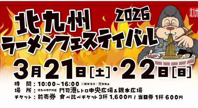北九州・下関・筑豊・京築が誇るラーメン店が一堂に会する、麺好きのためのビッグイベント「北九州ラーメンフェスティバル」が2026年3月21日(土)~3月22日(日)10:00~16:00に開催されます。