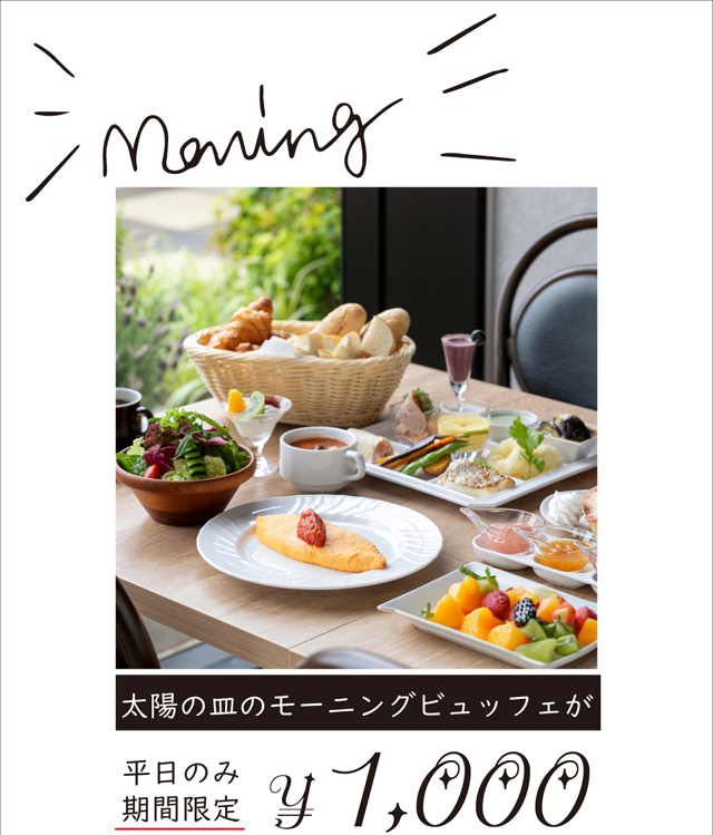 グローカルホテル糸島内レストラン、太陽の皿(福岡県糸島市泊844-1)では、平日のビジター様限定で、モーニングビュッフェを期間限定特別価格で提供します。大人通常1,760円のところ、1,000円で朝食を楽しめます。
