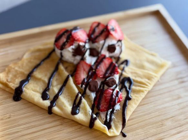 MOCCU純生クリームをたっぷり中間店でも1番人気の自家製生チョコとあまおうが入ったこの時期1番人気のクレープです。