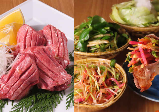 趣の異なる三種の香味野菜で包んで味わう博多流の焼肉スタイル。豆苗と白髪ネギのピリ辛野菜はシャキッとした辛味とコクを、セリと大葉の酢味噌和えは爽やかな香りと程よい酸味を、おろしとワカメ、レタスのポン酢和えはさっぱりとした後味を演出します。一口ごとに変わる風味で、最後まで飽きずに楽しめる巻き焼肉です。
