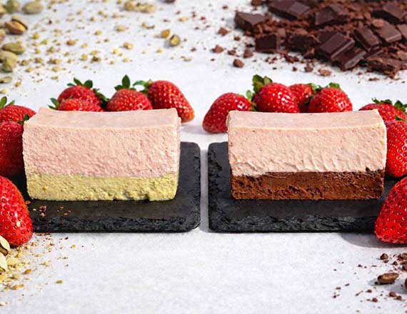 太宰府にあるチーズケーキ専門店。濃厚なチーズと、あまおうの風味が広がるケーキをベースに、ピスタチオ味とチョコレート味の2種類を用意。