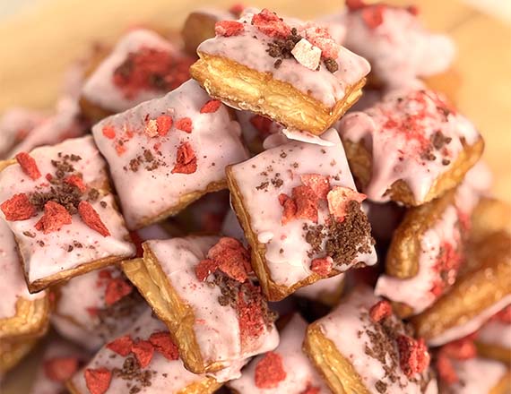 鎌倉発アップルパイ専門店。人気商品キャラパイから待望の新作「ストロベリーキャラメルパイ」が登場!千層に重ねたパイ生地にたっぷり苺チョコをコーティングしました。