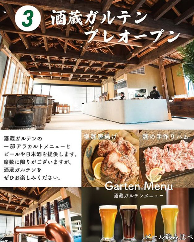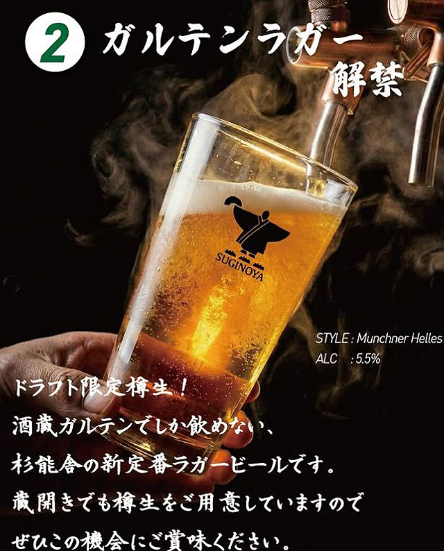 今年も今季搾ったばかりの新酒でお出迎え。生酒や限定酒など多数用意。また、酒蔵ガルテンでは、樽生限定ビール「ガルテンラガー」が解禁します。酒蔵ガルテンでしか飲めない杉能舎新定番のラガービールをご賞味ください。