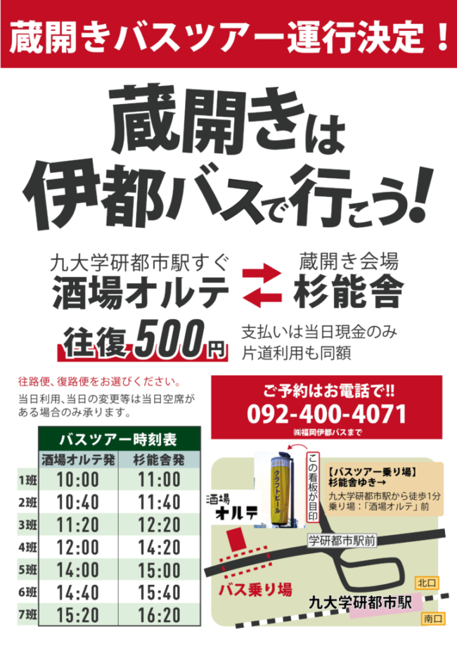 今年はバスツアーが運行中。これまでは「ドライバーだから飲めない」となっていた方も今年はバスツアーに乗れば安心です。九大学研都市駅から徒歩1分の場所から杉能舎までの直行バスが運行します。価格は往復500円。
