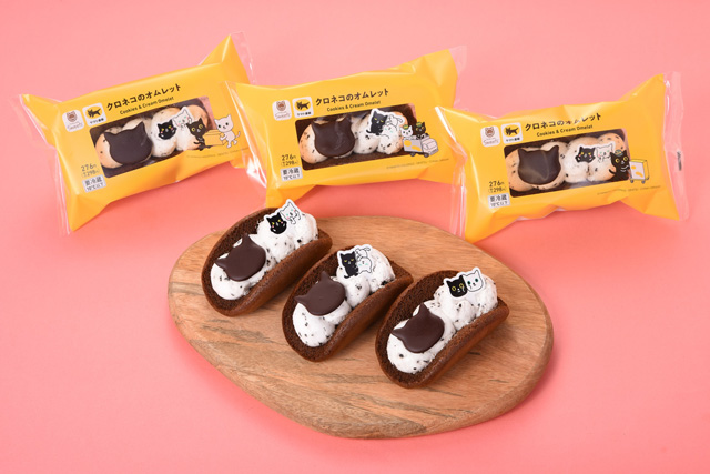 【内容】ふんわりココアオムレット生地でココアクランチ入りのクリームを包み、ヤマトグルーㇷ゚公式キャラクター「クロネコ・シロネコ」の紙ピック1枚とクロネコをイメージしたネコ型のビスケットをトッピングしました。紙ピック、パッケージともにデザインは全3種類です。※数量限定