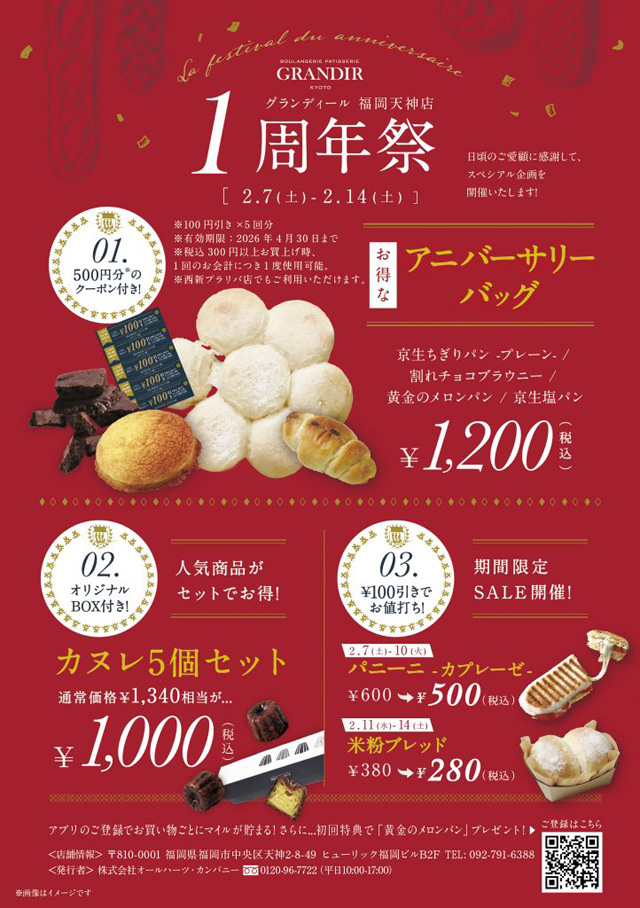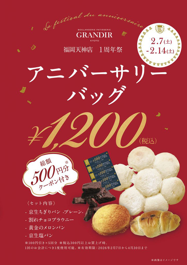 グランディール 福岡天神店(福岡市中央区天神2-8-49 ヒューリック福岡ビルB2F)は開店1周年を迎えます。の日頃の感謝を込めて、福岡天神店限定で2026年2月7日(土)~2月14日(土)までの期間中 、スぺシアル企画を多数開催。