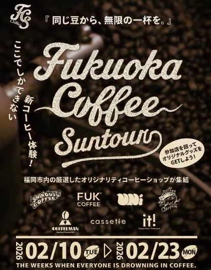 2026年2月10日(火)~2月23日(月)大濠・舞鶴公園周辺エリア(参加7店舗)にて「Fukuoka Coffee Suntour(福岡コーヒーサンツアー) 」が開催されます。