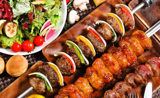 シュラスコの種類は20種類。一番人気のピッカーニャ/イチボや、柔らかい肉質と旨みランプなどの”肉塊串”、アバカシ/焼きパイナップル、”野菜串”、焼きチーズなど豊富なメニューがウリ。