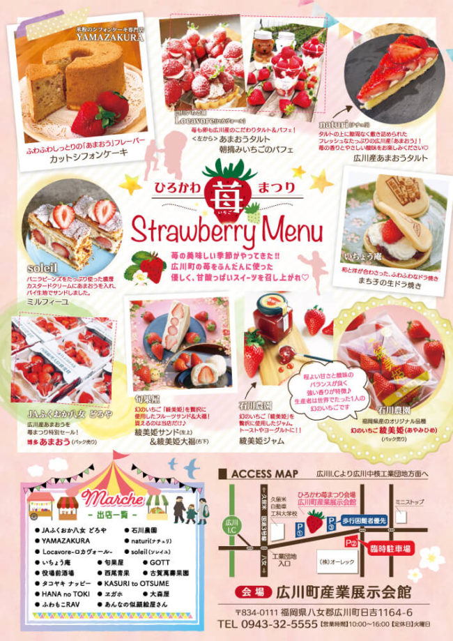 2026年3月14日(土)10:00~15:00、広川町産業展示会館(八女郡広川町日吉1164-6)にて、広川の苺を味わい尽くすスイーツの祭典「ひろかわ苺まつり」が開催されます。