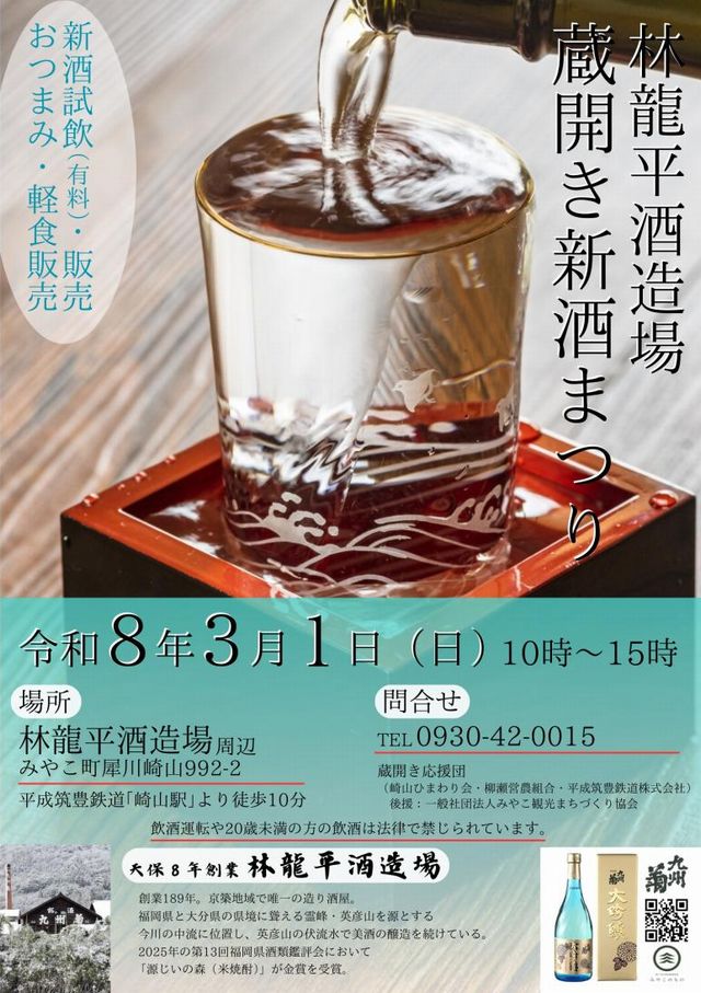 2026年3月1日(日)10:00~15:00、林龍平酒造場(京都郡みやこ町犀川崎山992-2)「蔵開き新酒まつり」が開催されます。入場料(無料)試飲、軽食(有料)。
