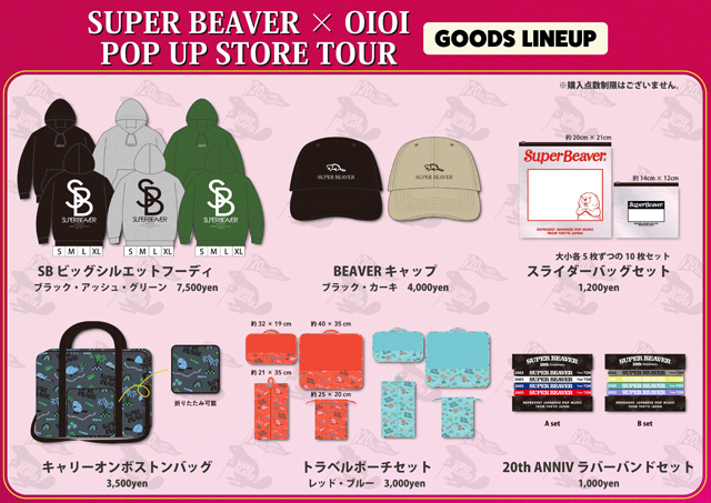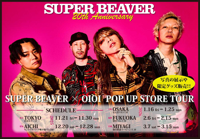 2026年2月6日(金)~2月15日(日)10:00~19:00(最終入場18:30)、博多マルイ(福岡市博多区博多駅中央街9番1号)7F イベントスペースにて、「SUPER BEAVER × OIOI POP UP STORE TOUR」を開催。写真展示や限定グッズも販売。