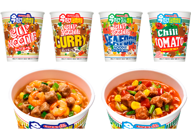 「カップヌードル」「カップヌードル カレー」「カップヌードル チリトマトヌードル」は “謎肉” を、「カップヌードル シーフードヌードル」は “カニカマ” を、それぞれ約55%増量。