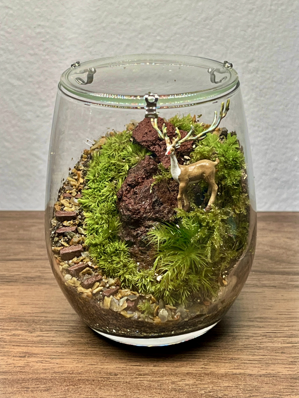 オリジナルのミニチュアレンガを使用して苔テラリウムの中に階段を作ります。3種類の苔でシンプルな苔テラリウムを作成します。