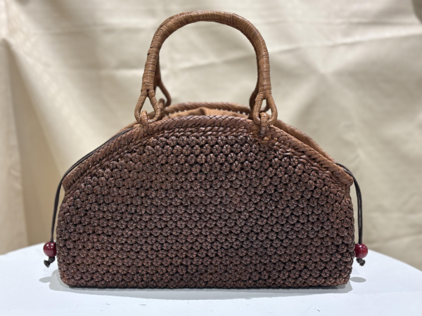 山葡萄カゴバッグは水に強く粘りがあり丈夫で長持ち、3mmの極細の蔓を編み込んだ弓型のバックです。
