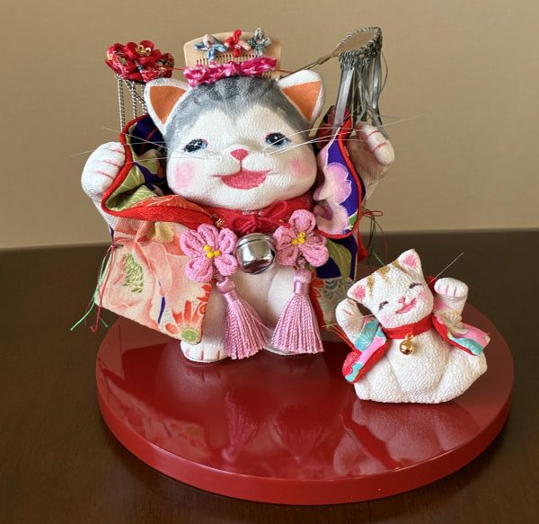 一つ一つ粘土で形を作り古ちりめんで着せ付けた愛嬌のある笑福招き猫です。
