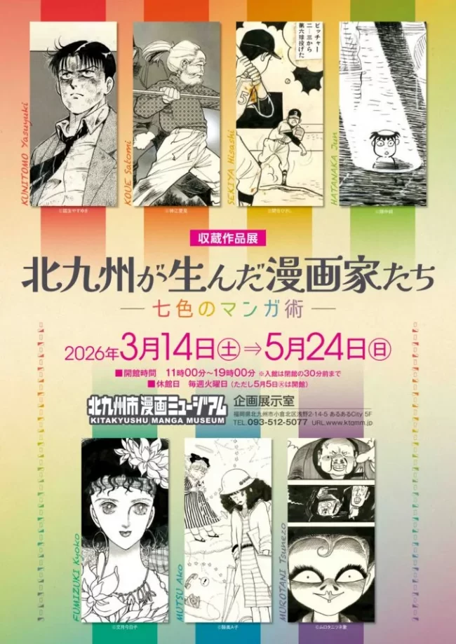 2026年3月14日(土)~5月24日(日)北九州市漫画ミュージアム(北九州市小倉北区浅野2-14-5 あるあるCity)5F 企画展示室にて「収蔵作品展 北九州が生んだ漫画家たち―七色のマンガ術―」が開催されます。