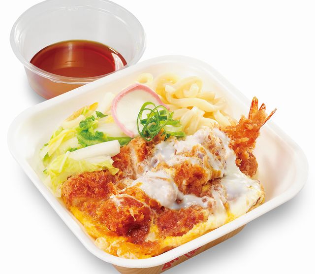 ほんのり甘い白だしつゆにロースカツ・海老フライ・白菜・かまぼこ、そしてうどんを合わせ、食べ応え抜群の定食に仕上げました。衣に白だしの旨みがじゅわっと染み込み、ひと口ごとにやさしい味わいが広がる、ご飯が止まらない一品です。定食はおとし玉子で仕上げており、とろりとした玉子をロースカツや海老フライを絡めることで、よりまろやかな味わいへと変化します。