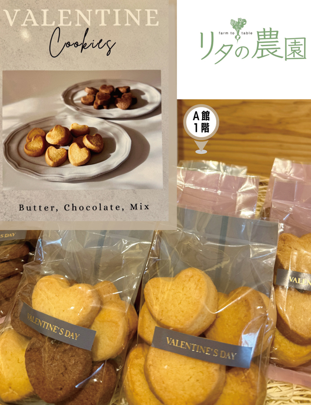 リタ特製 「バレンタインクッキー」 販売中。パティシエ率いるスイーツチームが手がけた、バレンタイン限定のクッキー。香り豊かなバタークッキーと、ほどよい苦味のチョコレートクッキー。どちらも味わい深い仕上がりで、大人のティータイムにもぴったりです。10個入りで500円。