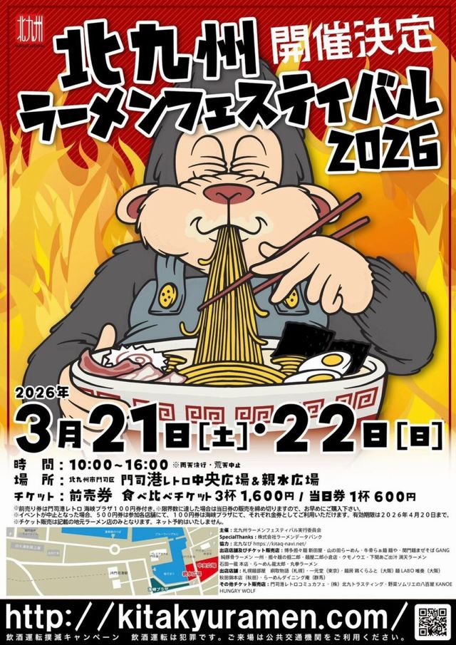 北九州・下関・筑豊・京築が誇るラーメン店が一堂に会する、麺好きのためのビッグイベント「北九州ラーメンフェスティバル」が2026年3月21日(土)~3月22日(日)10:00~16:00に開催されます。