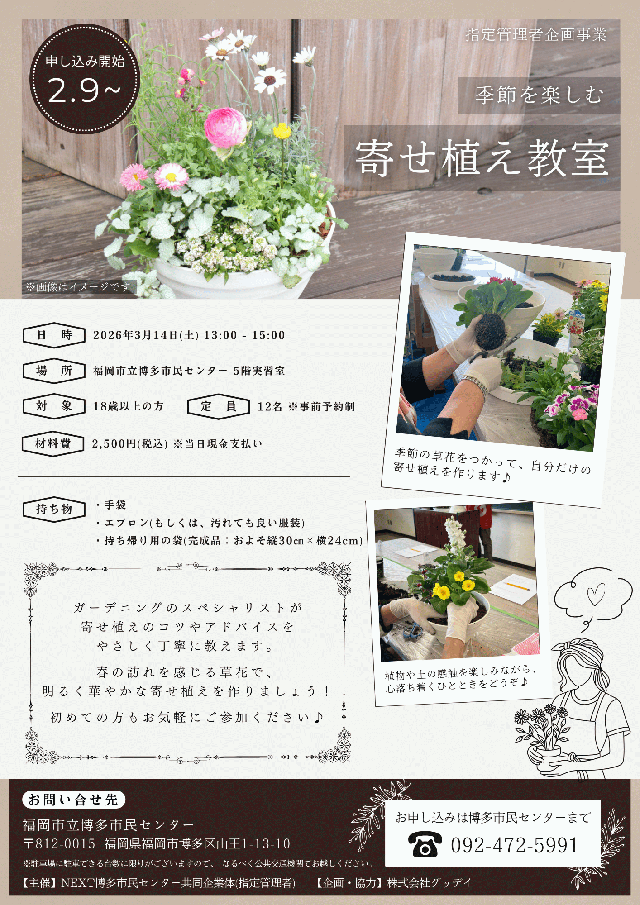ガーデニングのスペシャリストが寄せ植えのコツやアドバイスをやさしく丁寧に教えます!春の訪れを感じる草花で、明るく華やかな寄せ植えを作りましょう!初めての方も気軽にご参加ください。